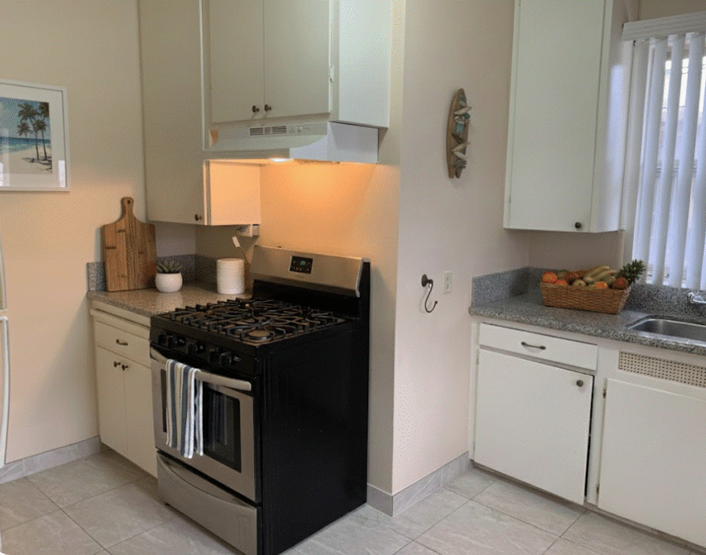 The kitchen is equipped with stainless steel appliances, granite countertops, and offers stunning skyline views. A classic built-in ironing board adds a touch of vintage charm and character.