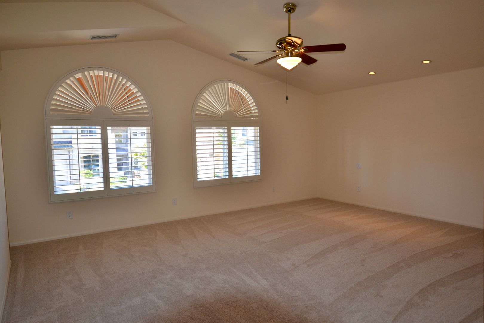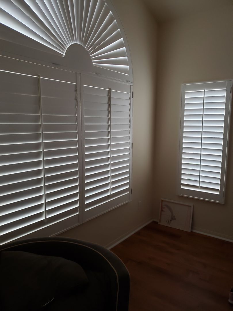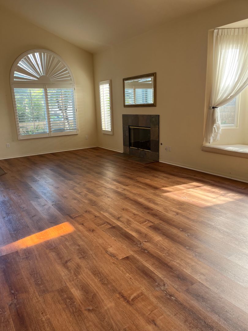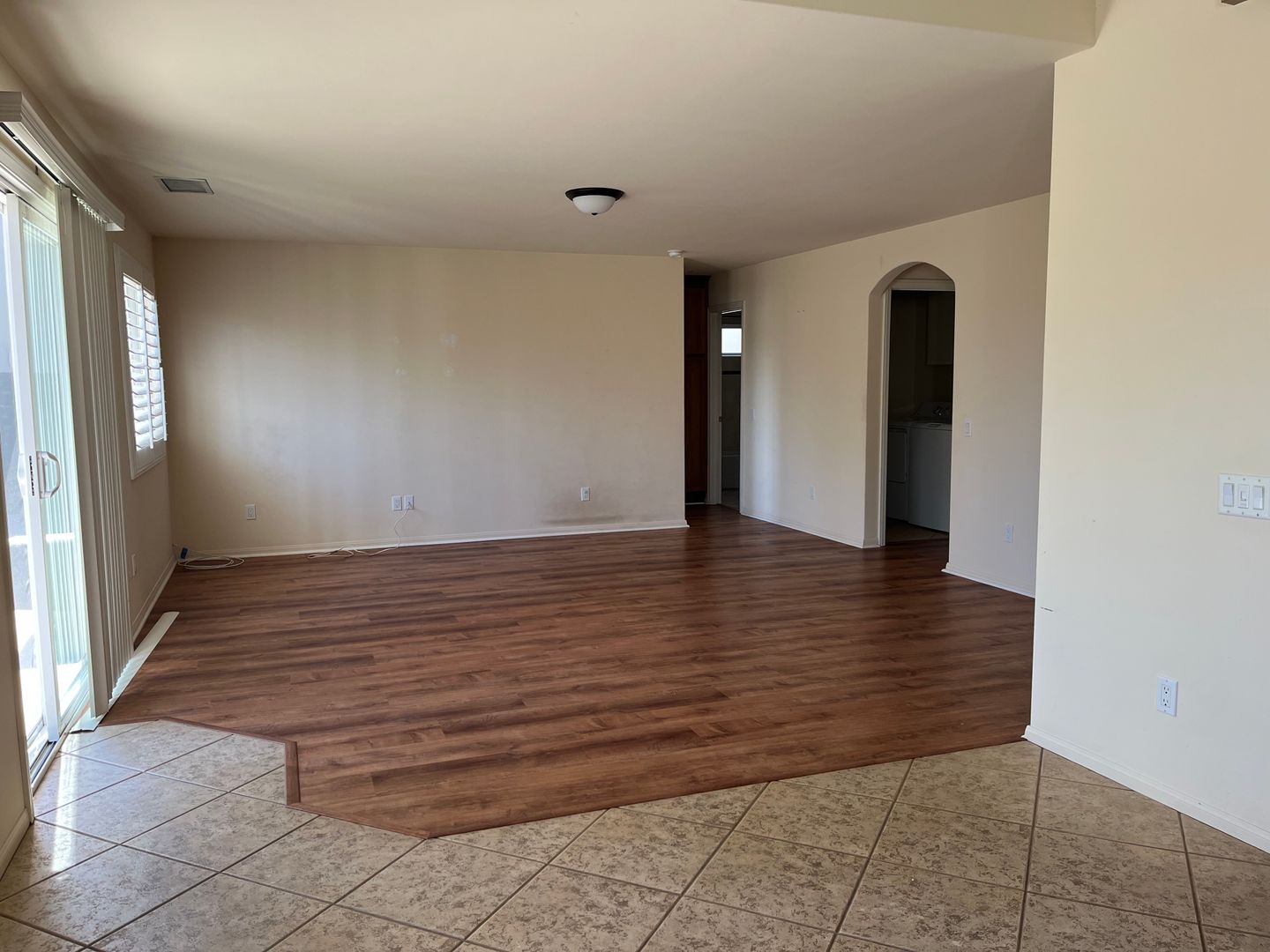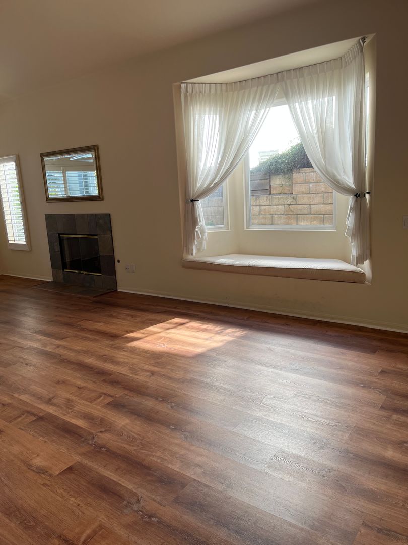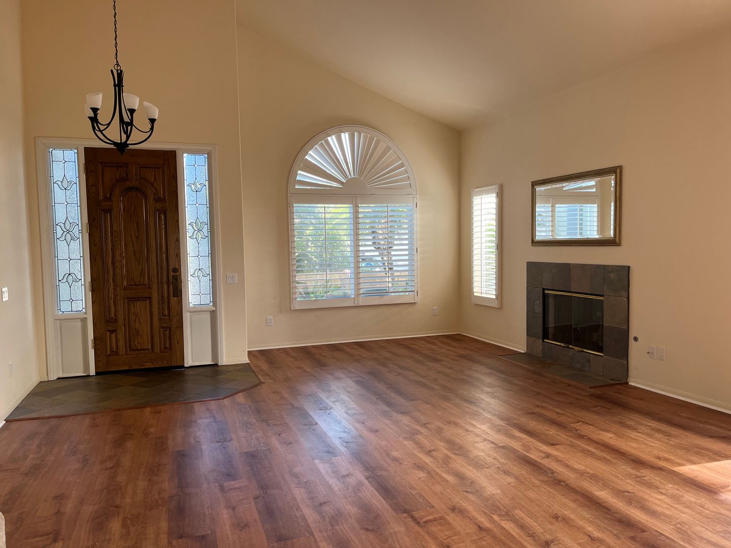 Luxury vinyl plank flooring throughout the living room and family room making the living room very spacious with vaulted ceilings. Windows include white shutters for privacy in the evenings or when needed.