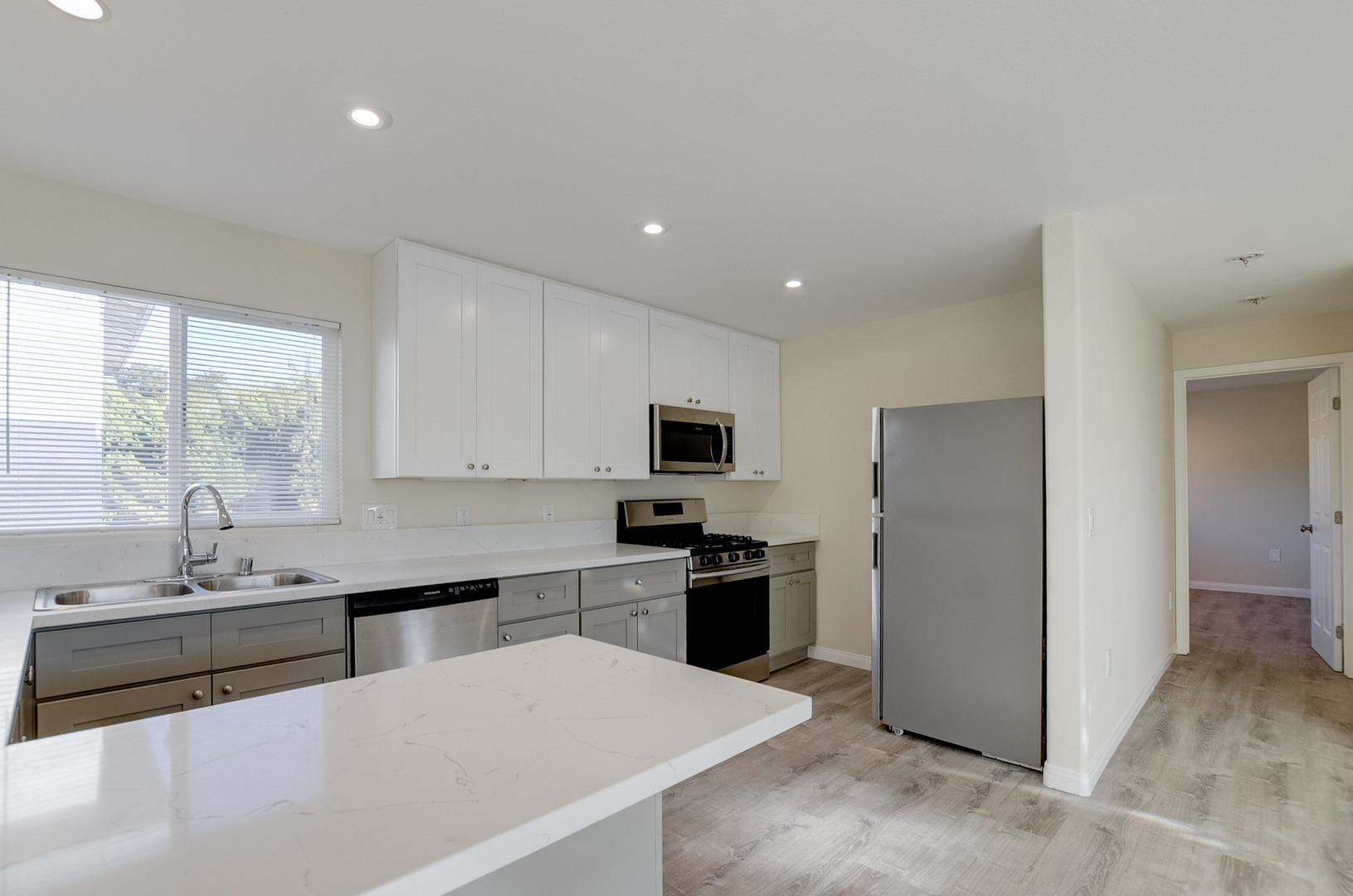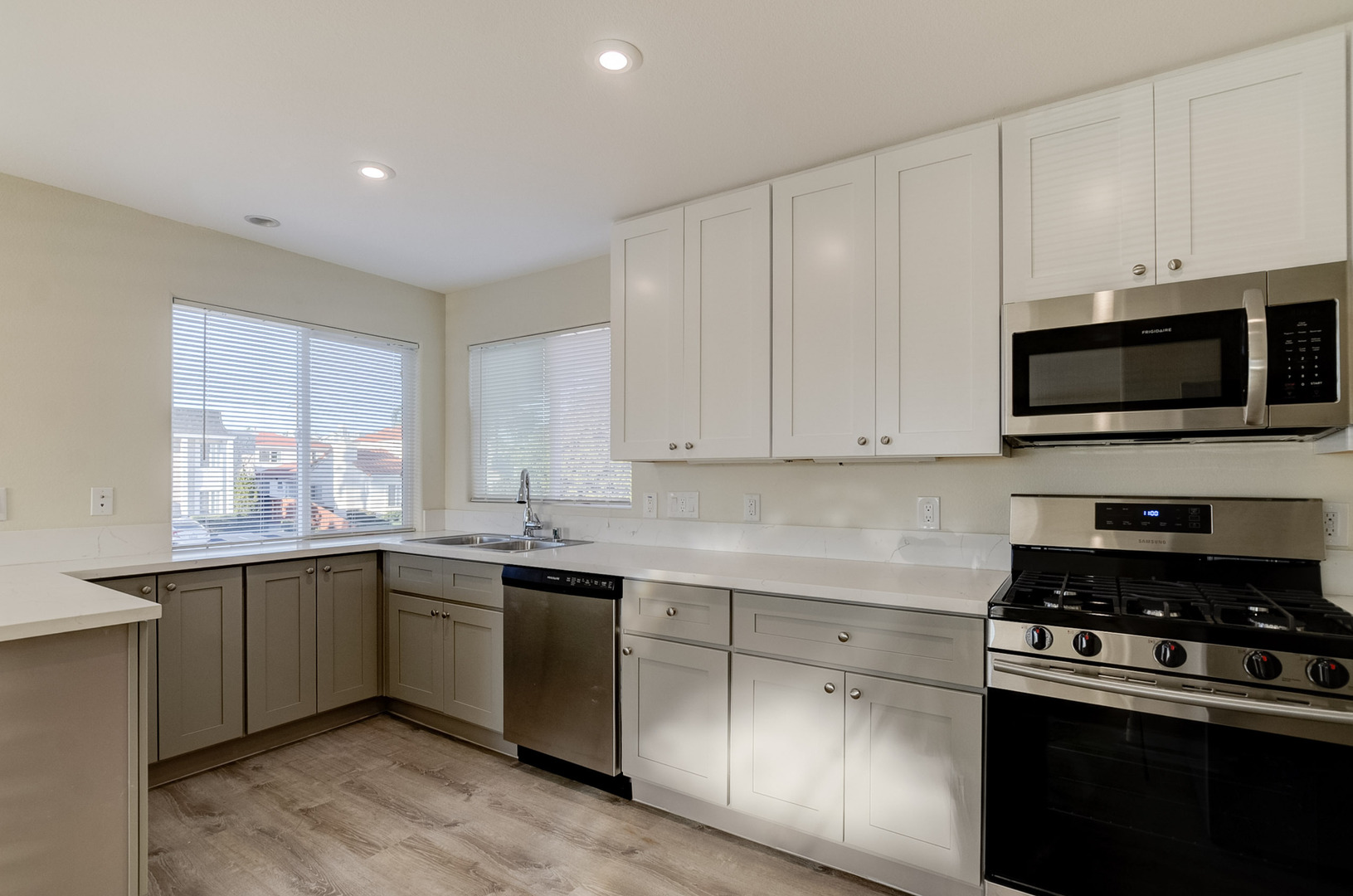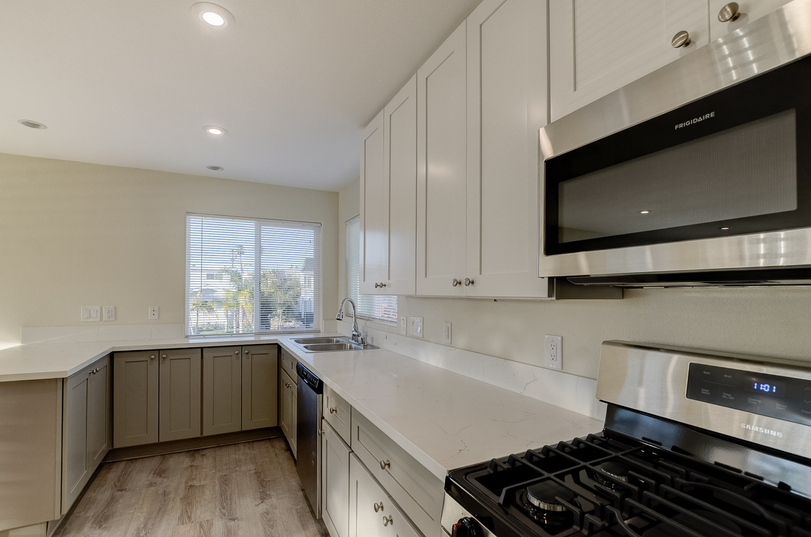 - Modern kitchen with stainless steel gas range, dishwasher, refrigerator, and microwave