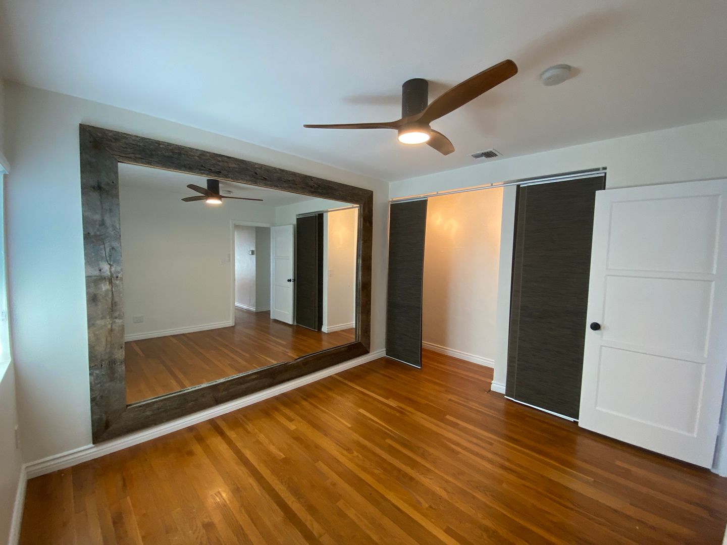 Relax in front of FIREPLACE in the DEN or retreat to cool under ceiling fans in any bedroom!! The PRIMARY suite is full of light and direct access to MASSIVE backyard. Sleek and space saving hidden WALK IN CLOSET plus storage! The SECOND bedroom is great for an office, yoga, or work out room. The room has a custom reclaimed wood framed mirror that makes a great statement piece. AMPLE wall to wall storage and stay cool with CEILING FAN!